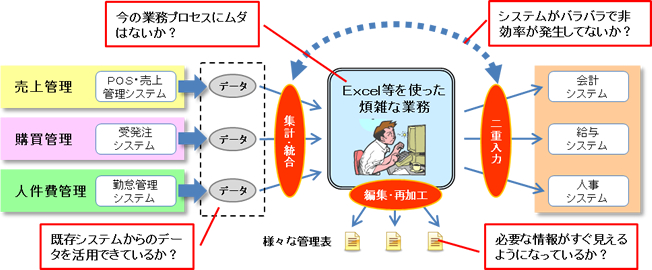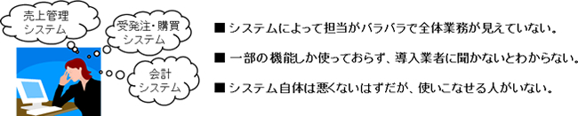 システムは導入してきたが、気がつけば導入したシステムもバラバラになっている。システム間が連携しておらず、結局人手の作業が減っていない。今はExcelを使って何とか作業しているが、煩雑でミスも多く人手もかかっている。